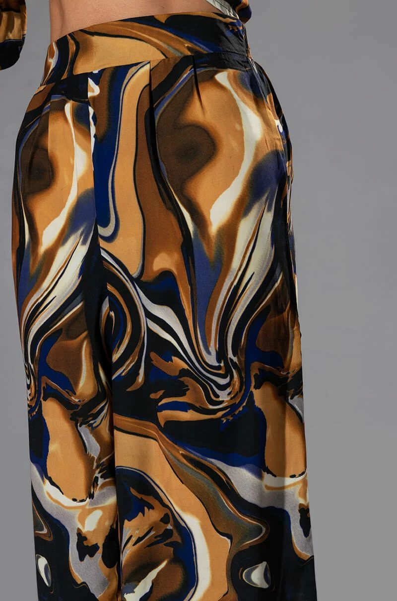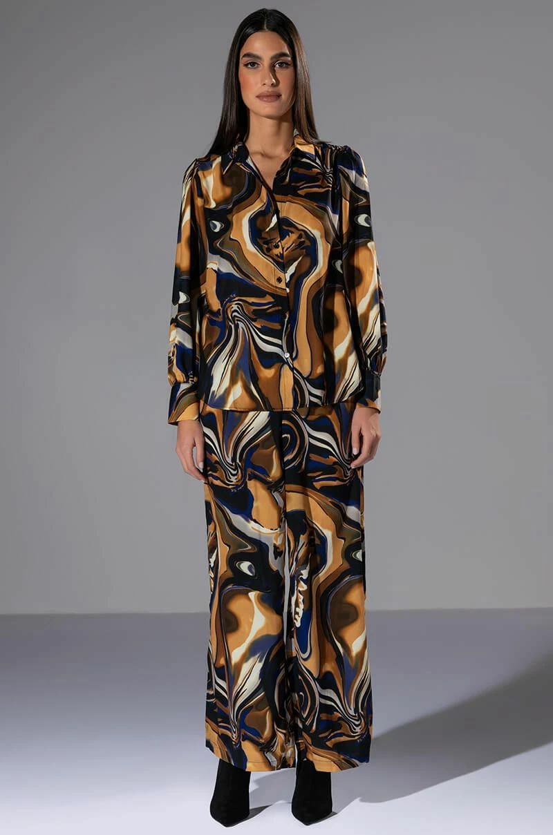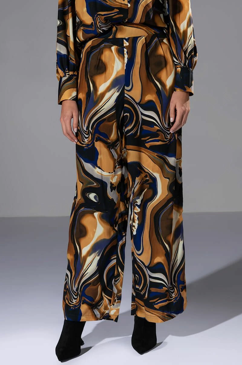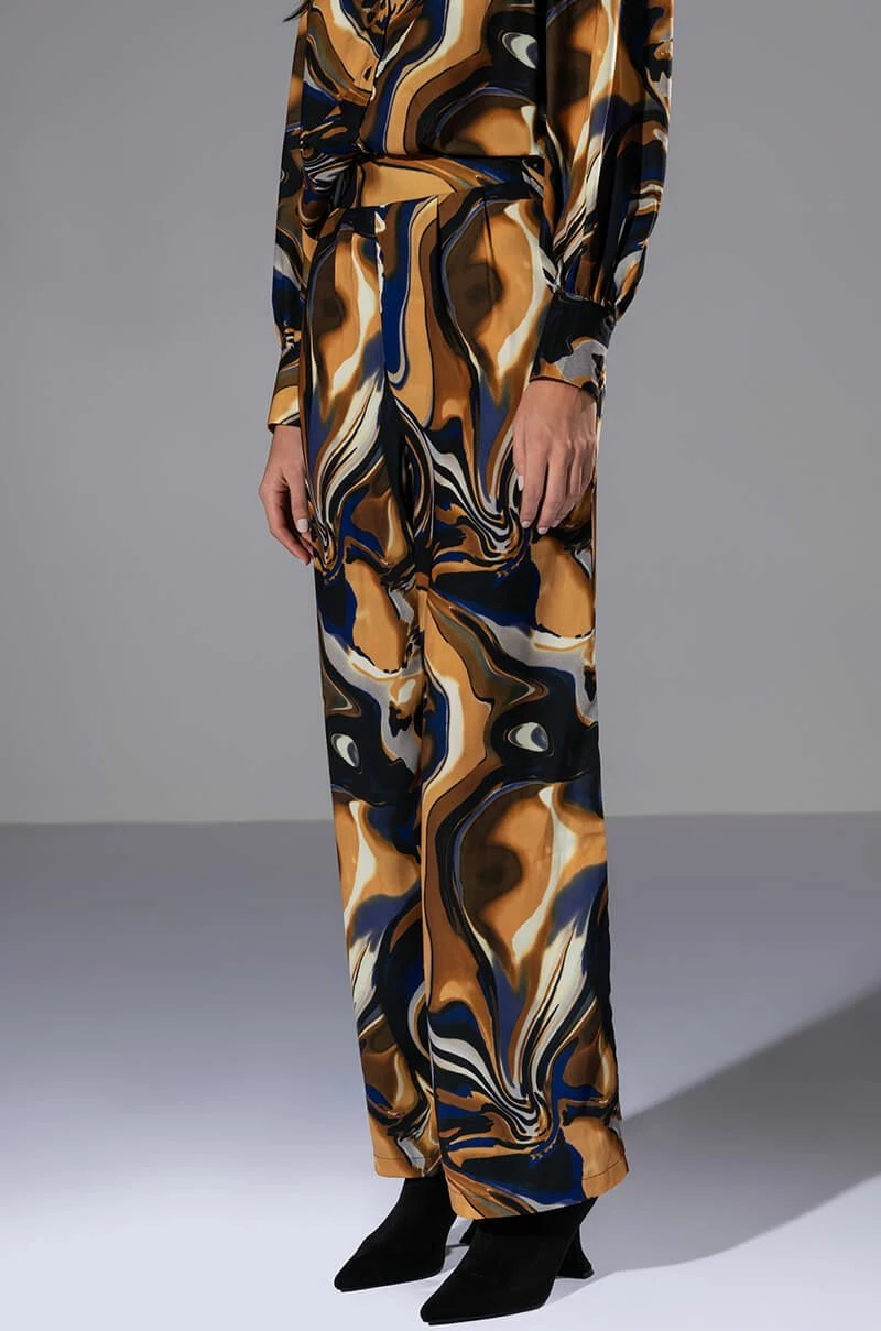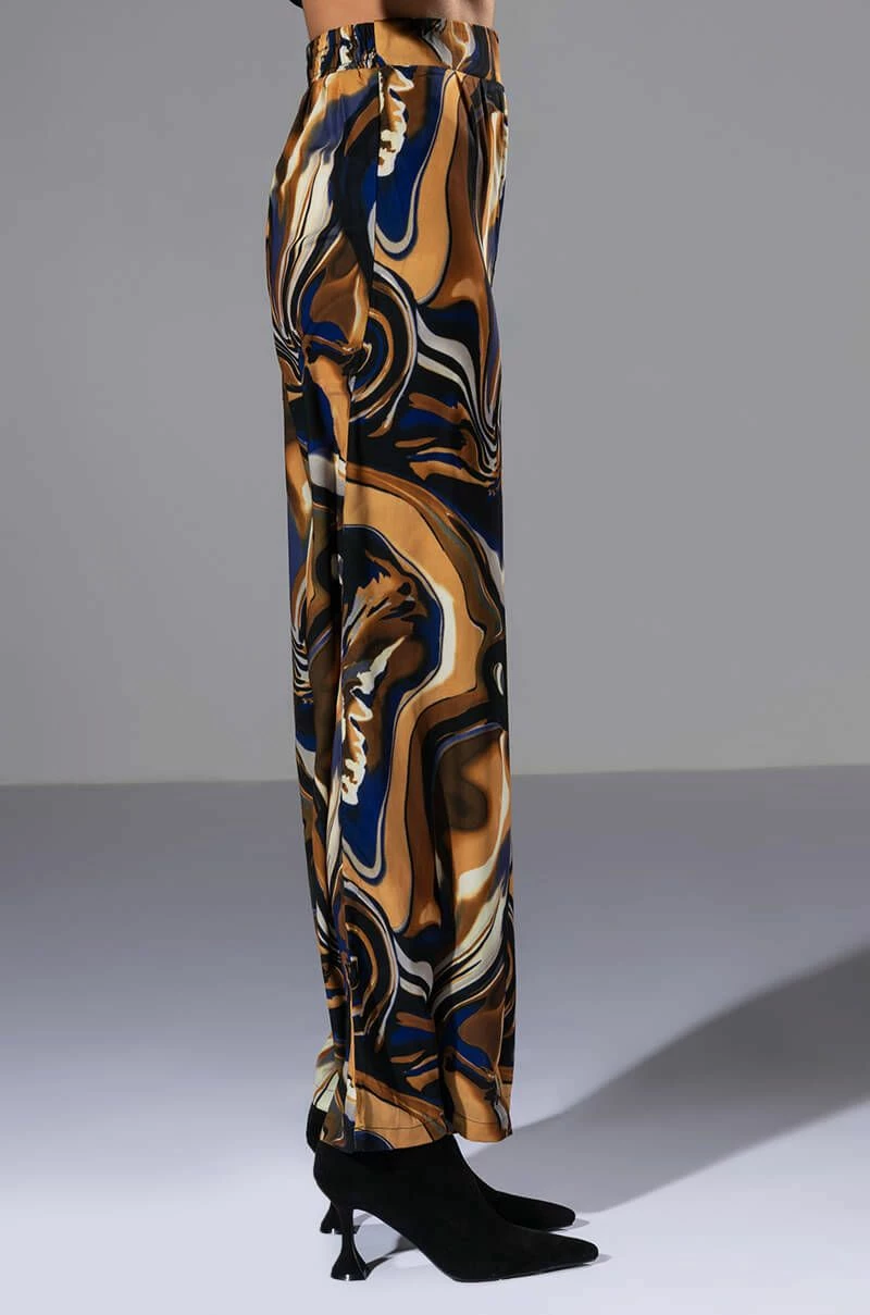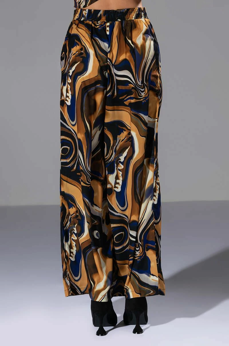 The AKIRA Label Solaris Printed Palazzo Pant is made from a slick, lightweight fabrication and features a warped, galaxy-like print, a high rise waist, a shirred back elastic waistband, pleated detailing, pleated detailing, a wide leg silhouette, and a pull-on fit. Pair this piece with the matching AKIRA Label Solaris Printed Button Down Blouse to complete your out of this world look.