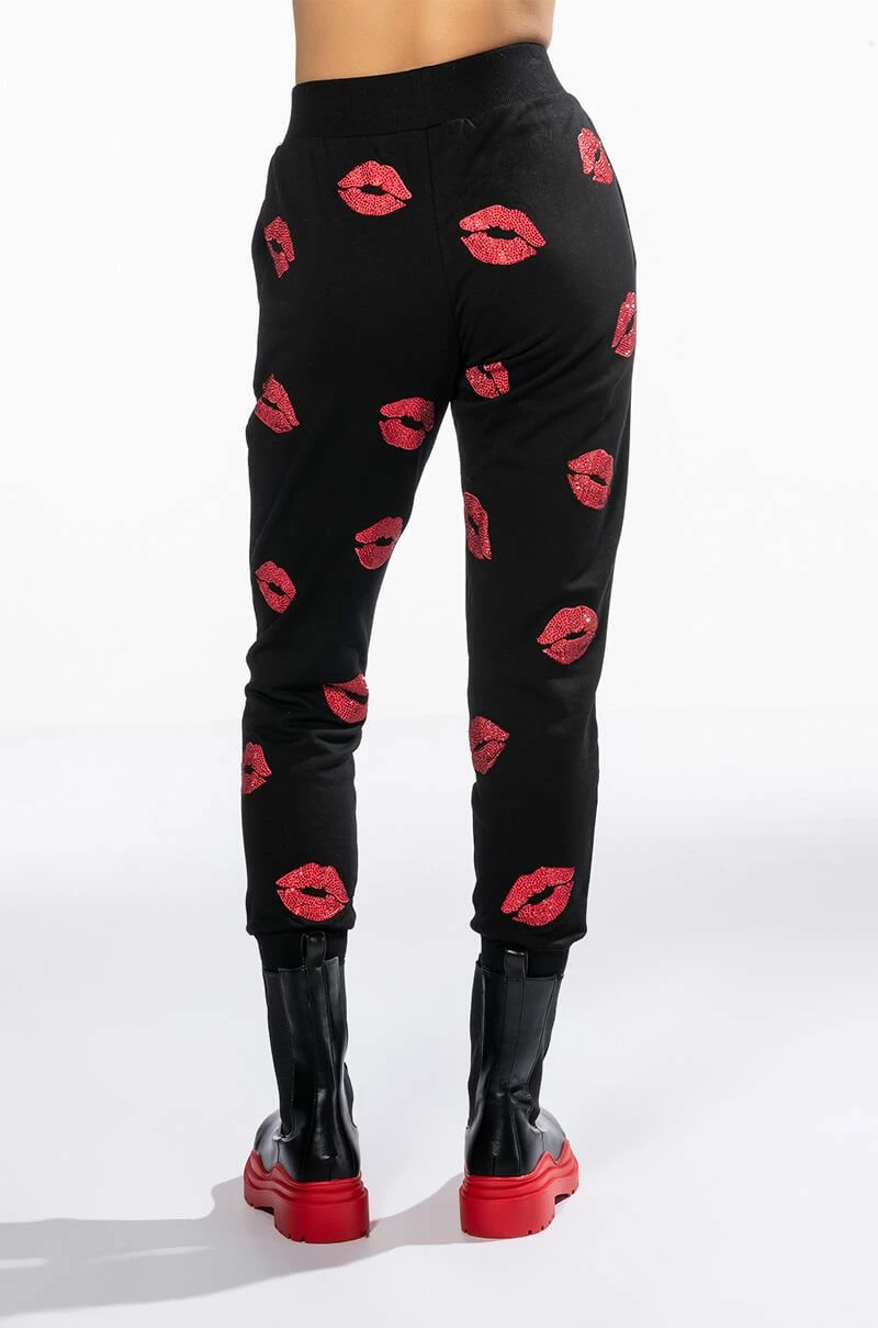 We have strong feelings for The AKIRA Label Superlove Jogger. These comfy athleisure pants feature a cozy cotton blend fabrication, an elasticated waistband, ribbed knit trim, slant side pockets, and a jogger silhouette with cinched ankle hems. Complete with rhinestone-embellished lipstick print patterning. Pair this piece with the matching AKIRA Label Superlove Hoodie to complete your look!