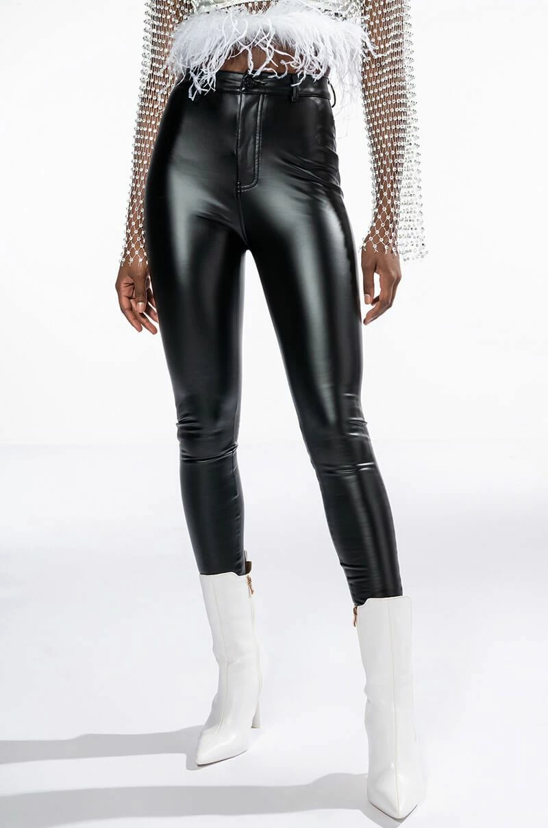 Love to love ya. The AKIRA Label Te Quiero High Rise Vegan Leather Skinny Pants With 4 Way Stretch are a stretch fabricated, faux leather based pant complete with a high waist rise, zipper fly button fasten, belt loops, back pockets and a straight leg fit. Pair with your favorite cross front bodysuit and strappy stilettos to complete the look. Size up for best fit.