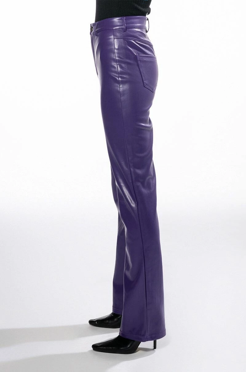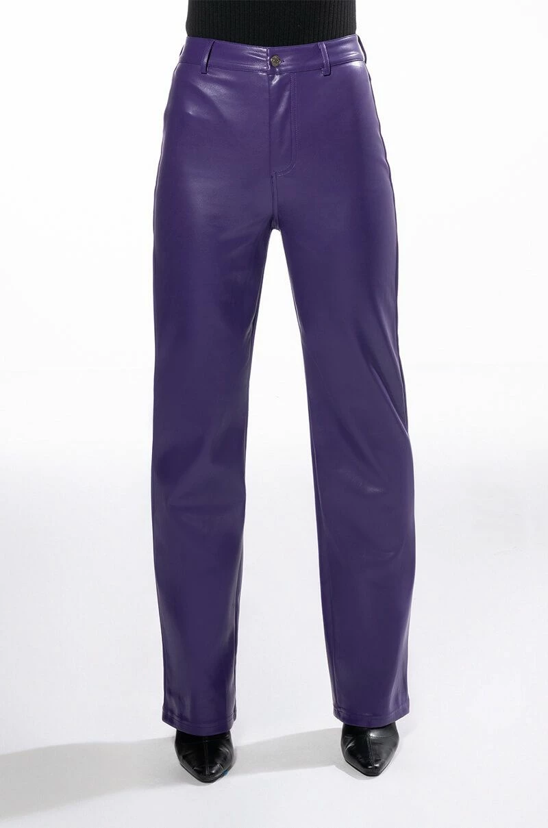 Feel the love with The AKIRA Label Te Quiero High Rise Vegan Leather Straight Leg Pants In Purple! These closet must-haves are made from a soft vegan leather fabrication and feature a high rise waist, working belt loops, a straight leg silhouette, back pockets, and a button and zipper front closure. Pair these bottoms with a mock neck top, beret, and booties to finish off your effortlessly chic look.