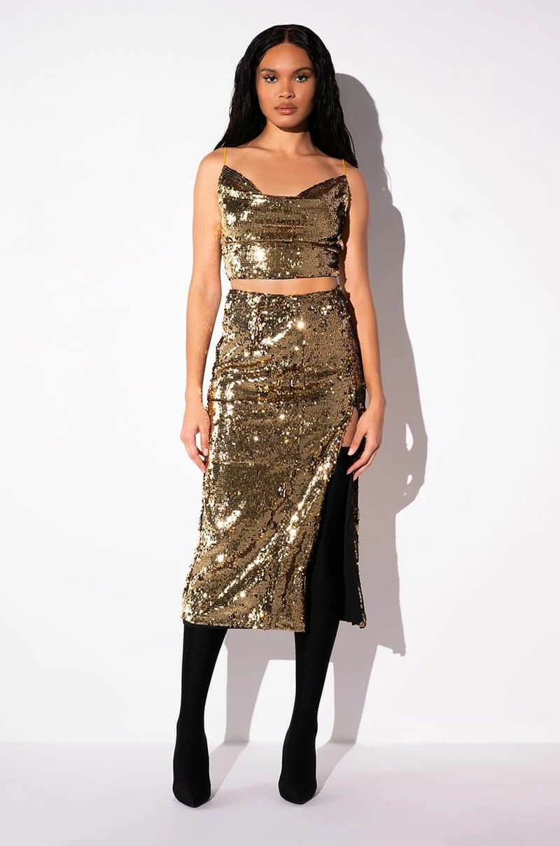 The AKIRA Label Thank The Academy High Slit Mesh Maxi Skirt features a sequin-embellished fabrication, a maxi length silhouette, a sexy high side slit, a smooth inner lining, and a concealed back zipper closure. Pair this glimmering piece with the coordinating AKIRA Label Thank The Academy Sleeveless Cowl Neck Crop Top for a complete look.