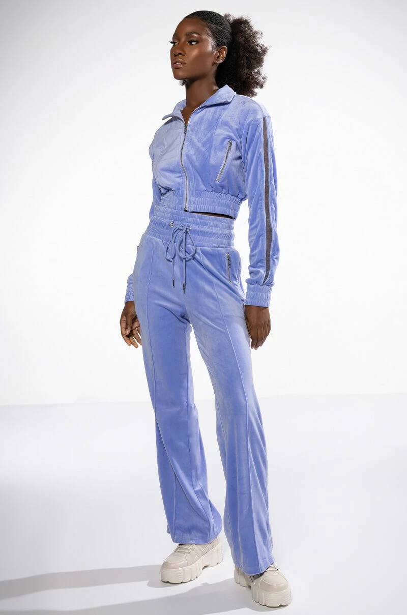 The AKIRA Label The Jet Setter Velvet Cropped Sweatshirt is made from a plush velvet fabrication and features a standing collar, long sleeves with sheer paneling, mock zipper slant pockets, column stitch detailing, ruched elastic hems, a cropped silhouette, and a front zipper closure. Pair this piece with the matching AKIRA Label The Jet Setter Velvet Wide Leg Jogger to complete your look.