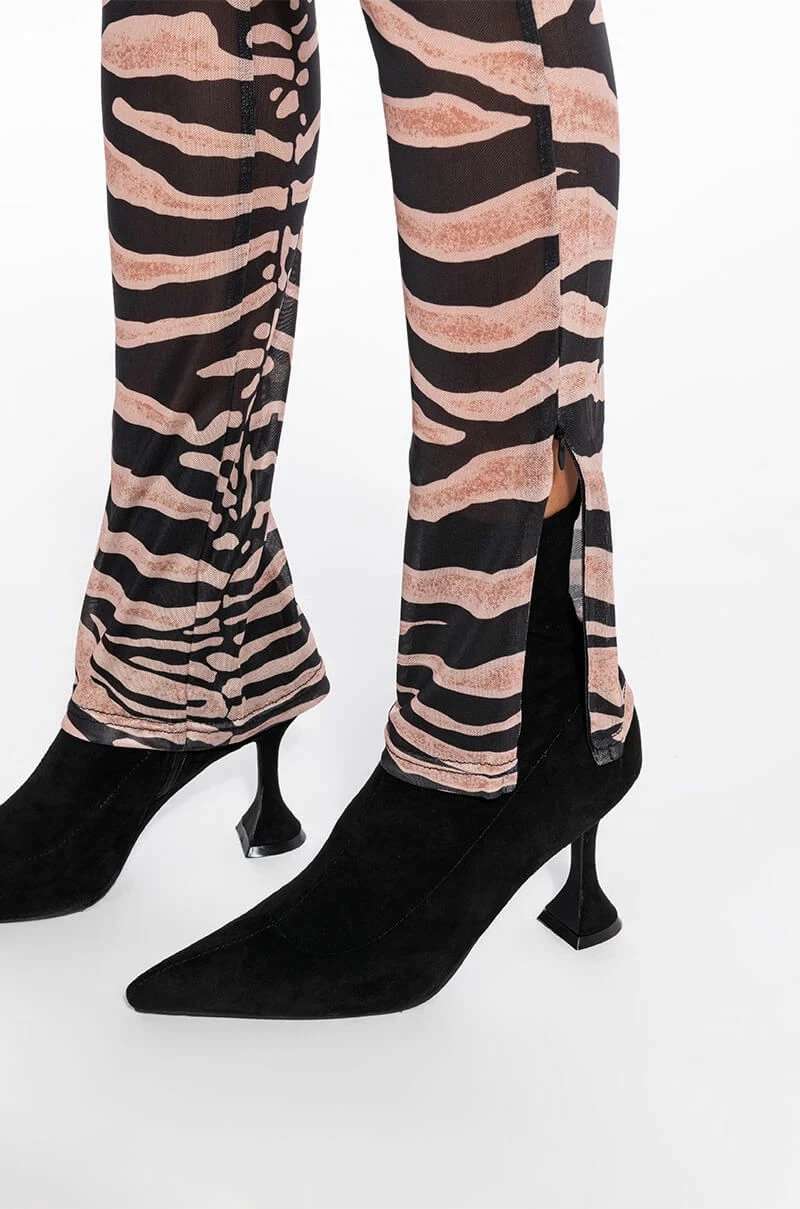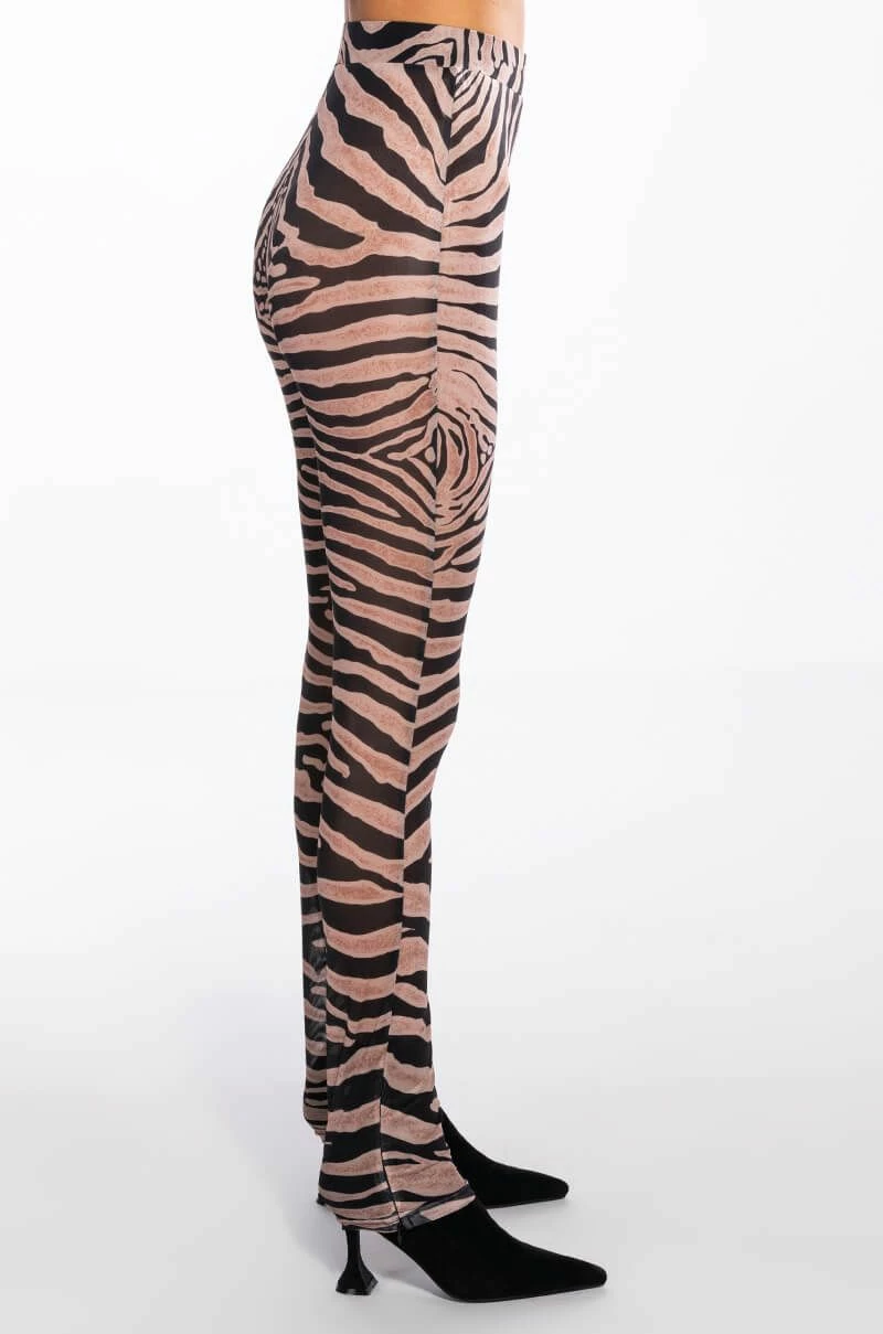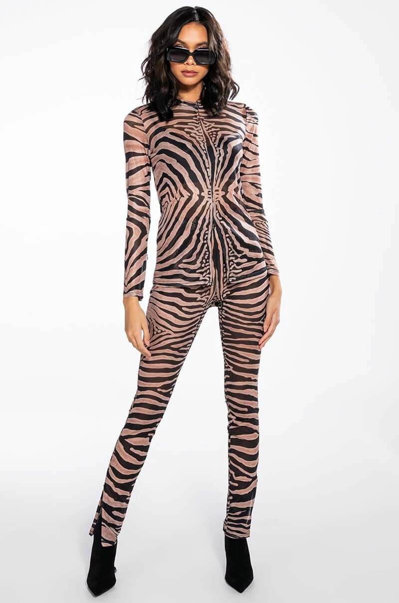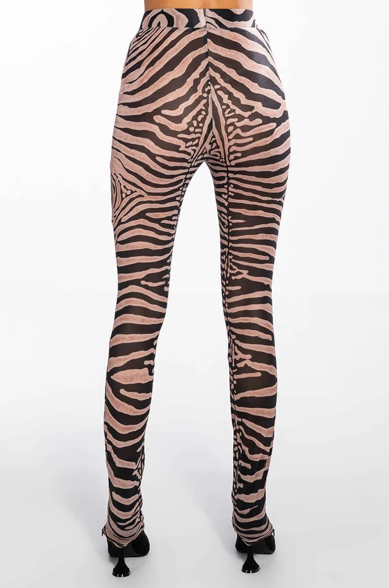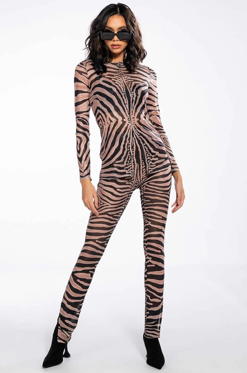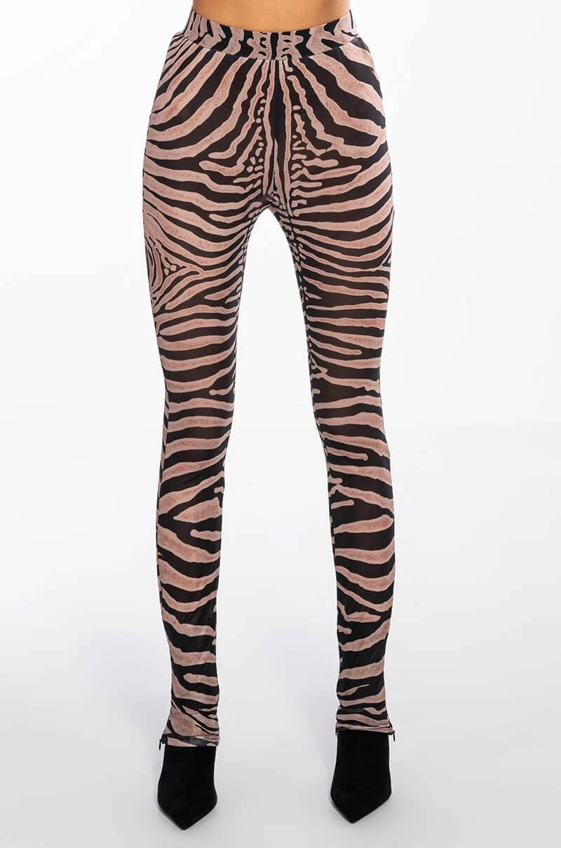 Keep it 100 with The AKIRA Label The Realest Side Zip Mesh Legging! These fierce bottoms are made from a sheer mesh fabrication and feature a bold zebra print, a high rise waist with a wide elastic waistband, skinny pant legs, and side ankle zippers. Pair this piece with the matching AKIRA Label The Realest Zip Front Mesh Top to complete your safari chic look.