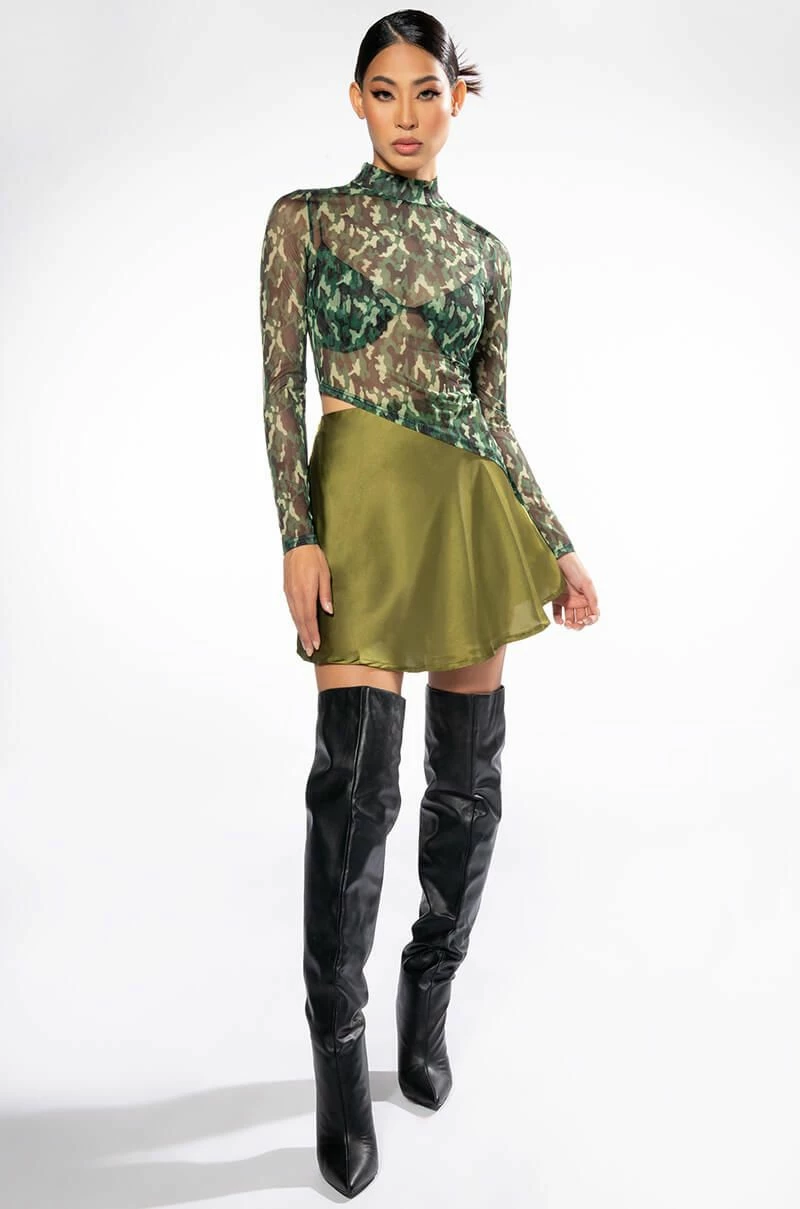 The AKIRA Label Thinking About Forever Satin Mini Skater Skirt is a shimmering satin number featuring a mini length, an inner skort, a concealed side zipper, and an elastic waistband. Pair with a cropped blouse and a pair of knee high boots.
