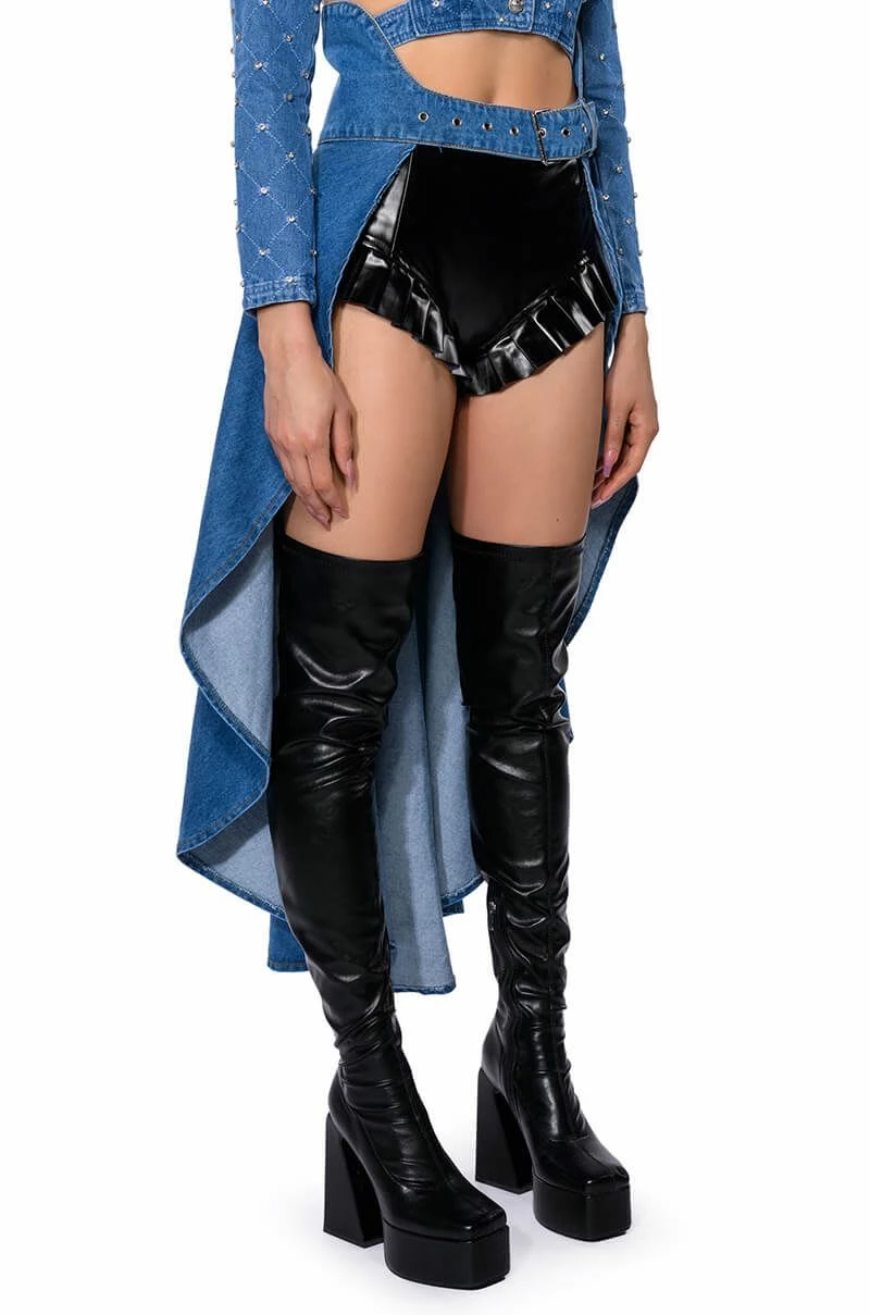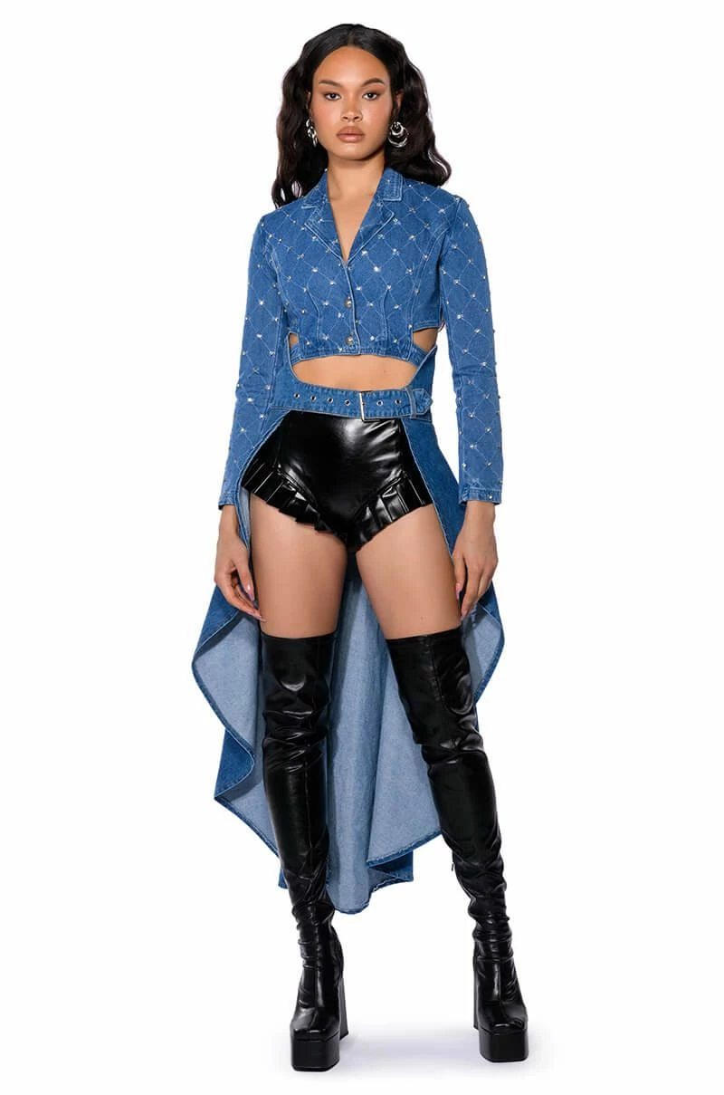 The AKIRA Label Walk On The Wild Side Denim Waist Belt is made from a cotton base denim fabrication and features a wide band base, a silver metallic buckle closure, and an attached long skirt train. Sits atop the waist for a cinched look
