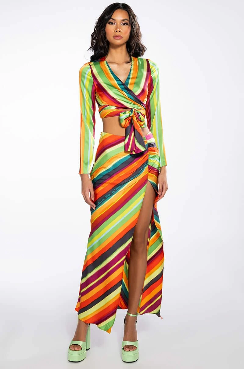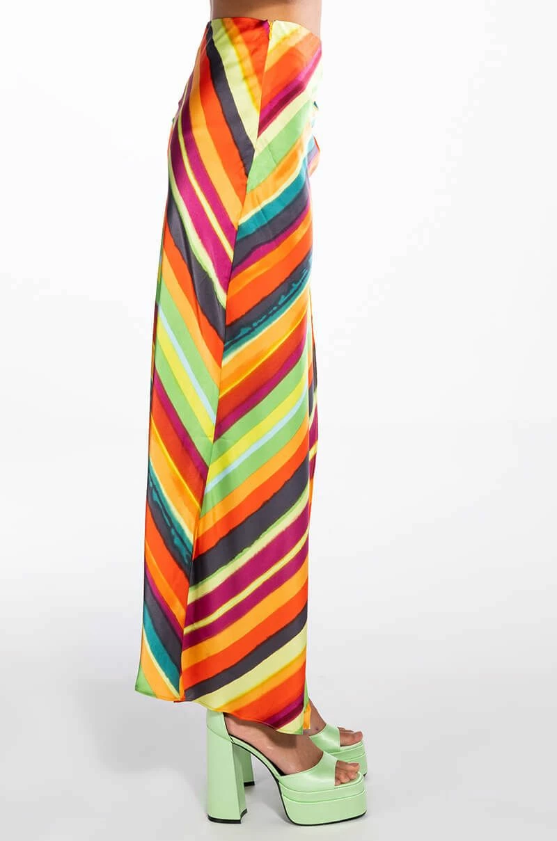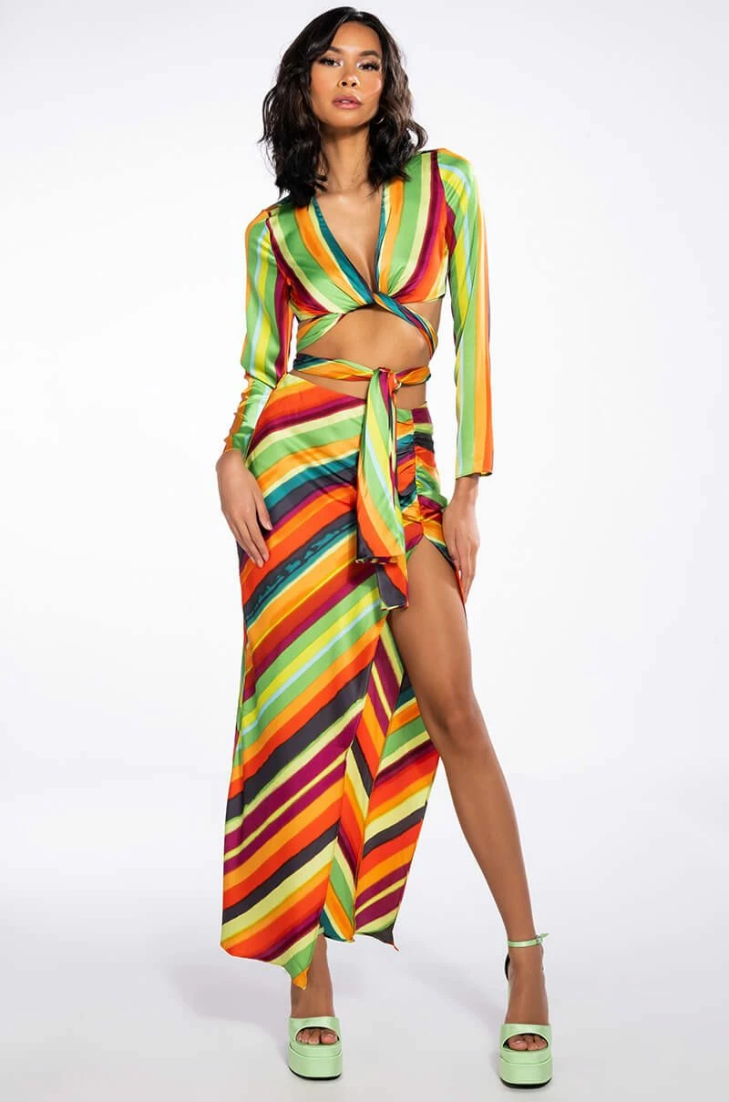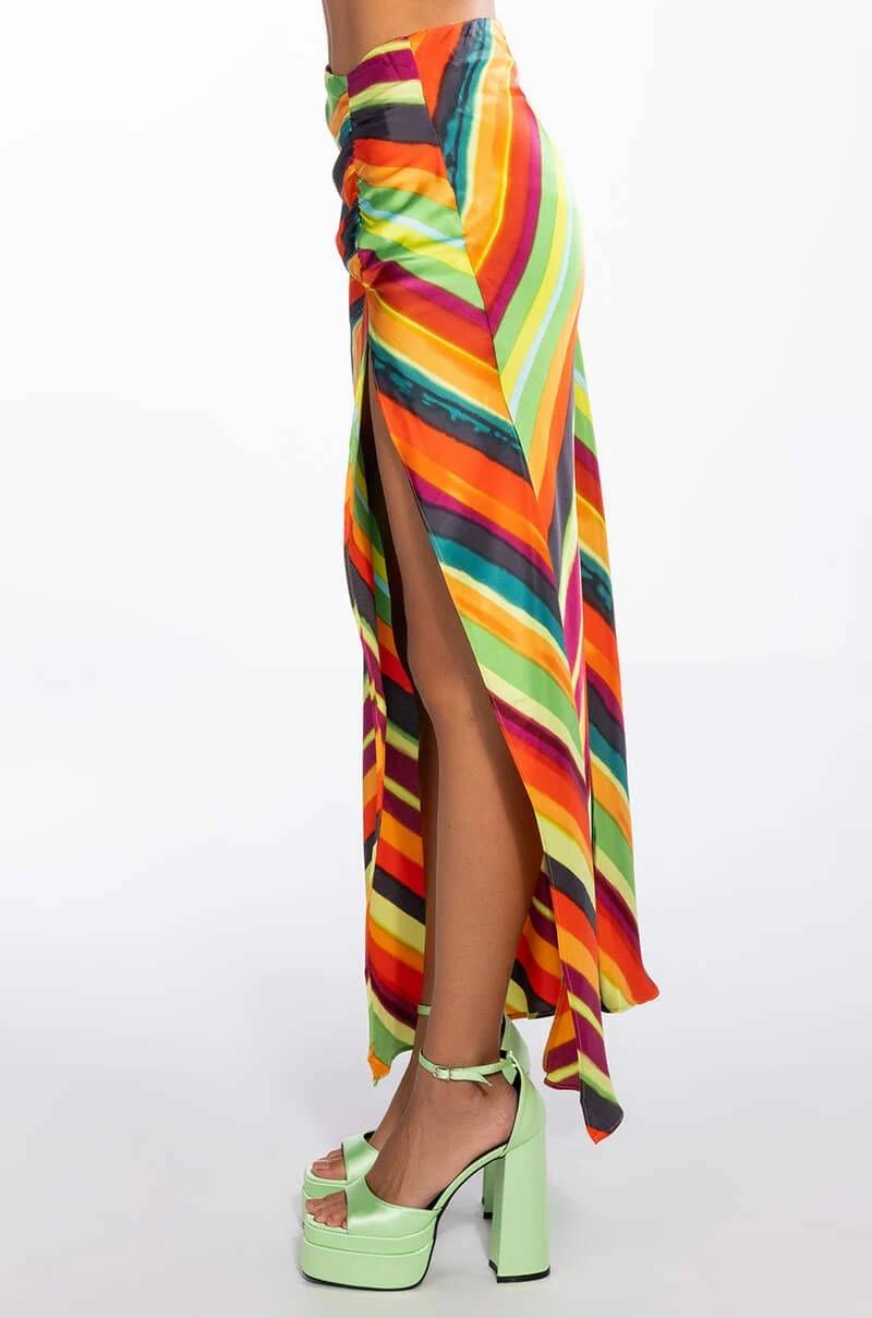 The AKIRA Label Want You To Want Me Midi Skirt With High Slit is made from a satin fabrication and features a multicolor striped pattern, a high rise waist with a thin elastic waistband, side ruched detailing with a sexy high slit, midi length, and a tonal side zipper closure. Pair this bold piece with the matching AKIRA Label Want You To Want Me Tie Front Blouse and platform sandals to finish off your vibrant look.