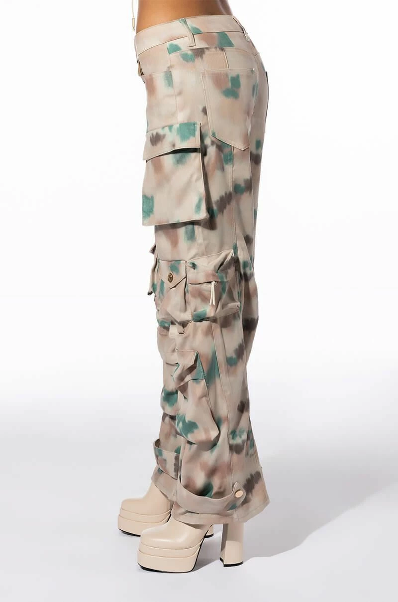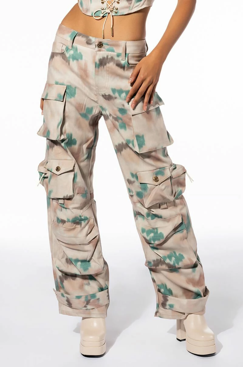We’re feeling hot as hell in The AKIRA Label Wildfire Cargo Pant. These laid-back bottoms feature a soft yet structured canvas fabrication, a high rise waistline, working belt loops, a classic 5-pocket design, large flap front cargo side pockets, and snap front and zippered cargo pockets throughout. Complete with a camo-inspired tie dye print patterning, a wide leg silhouette, and denim snap button ankle cinchers. Complete with a classic zip button closure. Pair with the coordinating AKIRA Label Wildfire Lace Up Corset.