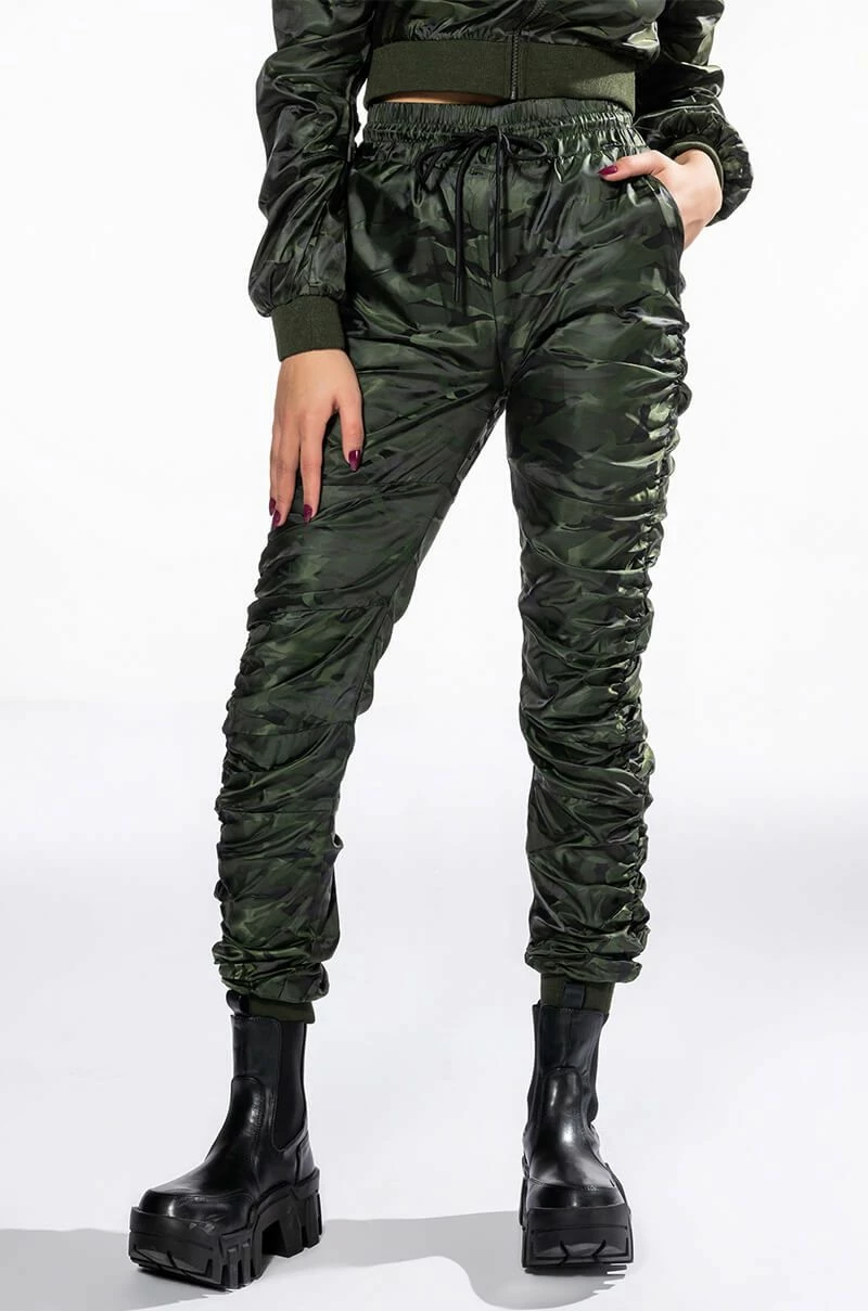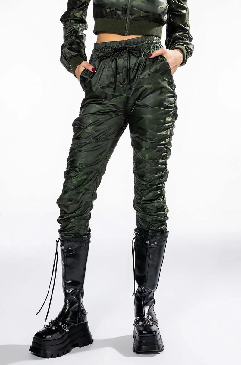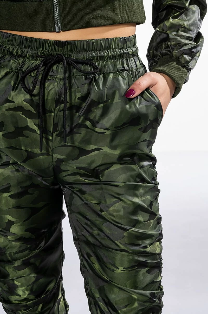 The AKIRA Label You’re The Problem Ruched Jogger is a slick nylon pant featuring an elasticated waistband, a drawstring waist tie, on-seam side pockets, and ruched detailing throughout. Complete with ribbed knit ankle cuff detailing and camo print patterning. Style with the coordinating AKIRA Label You’re The Problem Zip Up Top for a casual chic look.