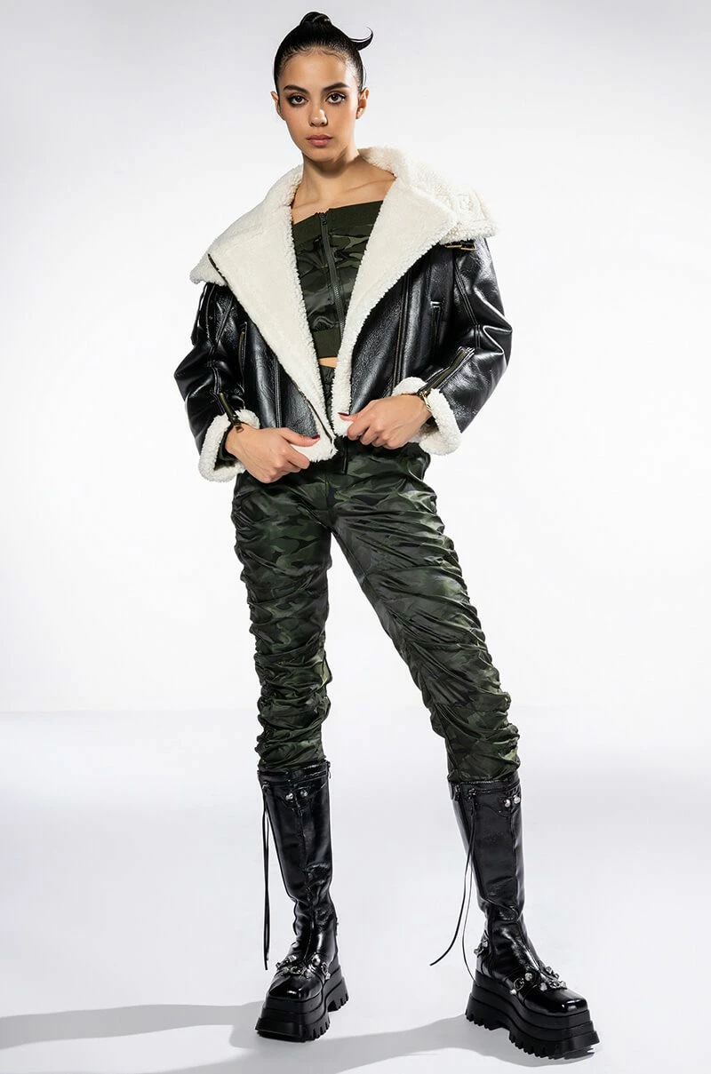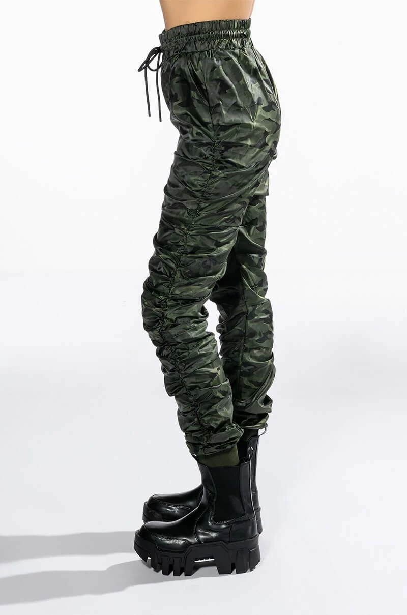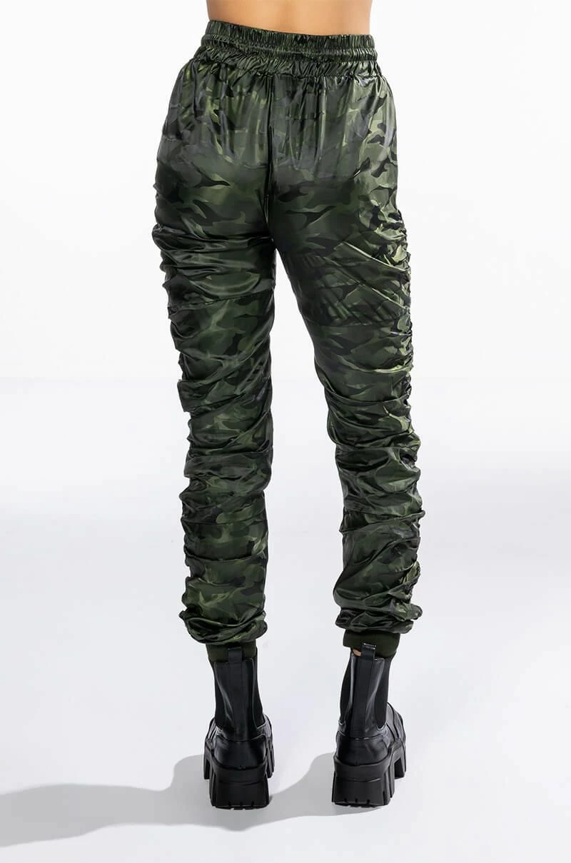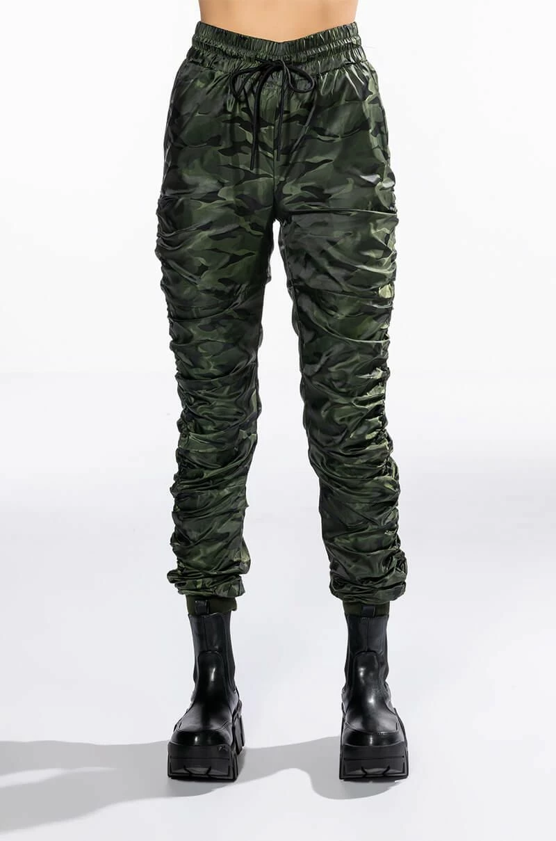 The AKIRA Label You’re The Problem Ruched Jogger is a slick nylon pant featuring an elasticated waistband, a drawstring waist tie, on-seam side pockets, and ruched detailing throughout. Complete with ribbed knit ankle cuff detailing and camo print patterning. Style with the coordinating AKIRA Label You’re The Problem Zip Up Top for a casual chic look.
